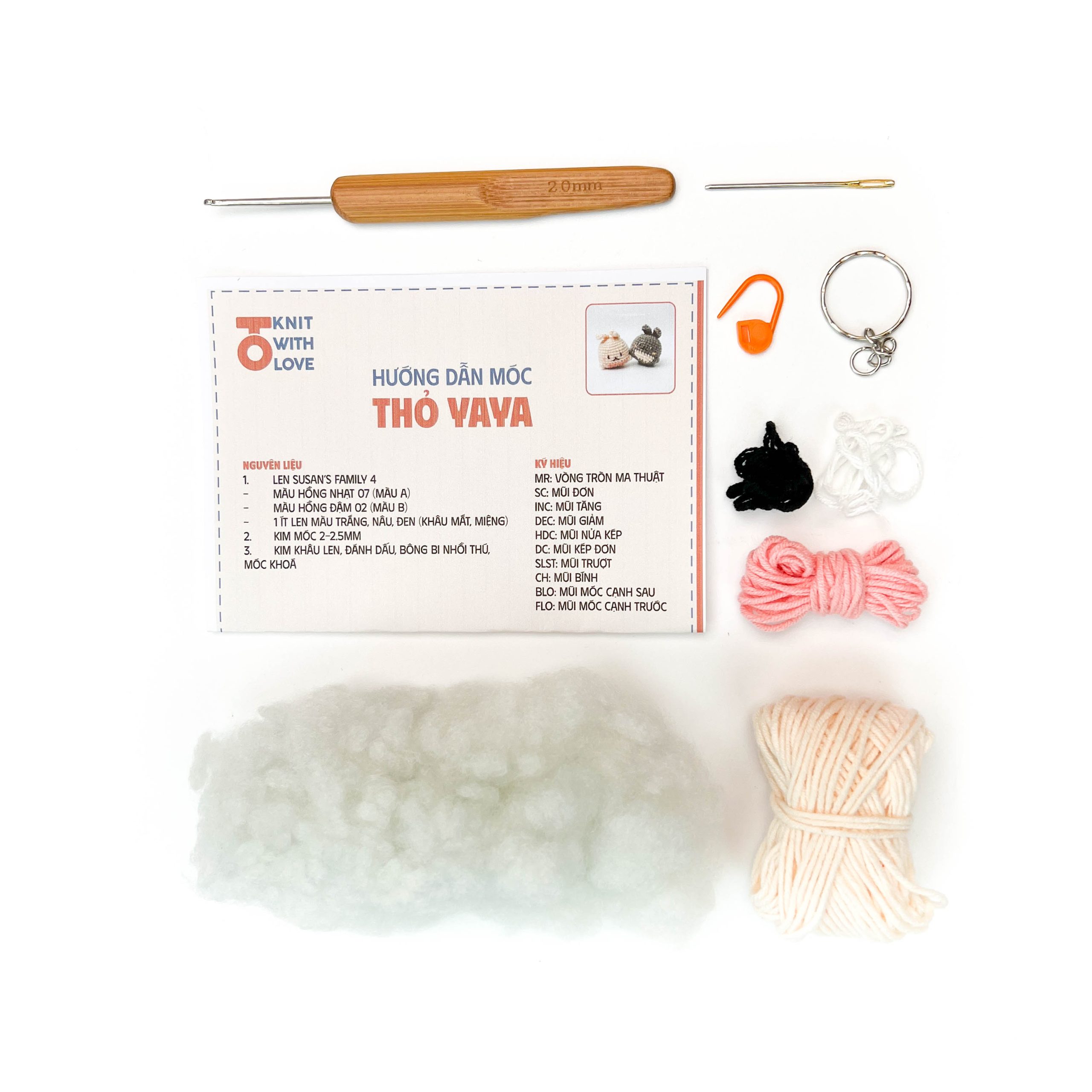Set nguyên liệu móc Thỏ Yaya là bộ nguyên liệu và dụng cụ móc len.Set nguyên liệu móc Thỏ Yaya phù hợp với các bạn đang tập móc thú bông, muốn tham gia 1 bộ môn nghệ thuật để giải trí, xả stress, luyện tập sự khéo léo và độ tập trung hoặc muốn tự làm 1 món quà tặng cho người thân, bạn bè. Set nguyên liệu móc Thỏ Yaya có thể tùy biến màu sắc theo sở thích của bạn.
